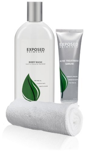 To really boost the acne fighting power we would look at the full Exposed Back and Body Acne Kit. It includes the deep cleansing body wash with exfoliating effects and a large-sized Derm-X body cloth that uses microdermabrasion to remove dead skin cells, dirt and sebum. It also comes with 2 tubes of the Exposed Skin Care Acne Treatment Serum to apply after shower, which adds all-day breakout fighting power to help clear pimples, clogged pores and prevent new blemishes.